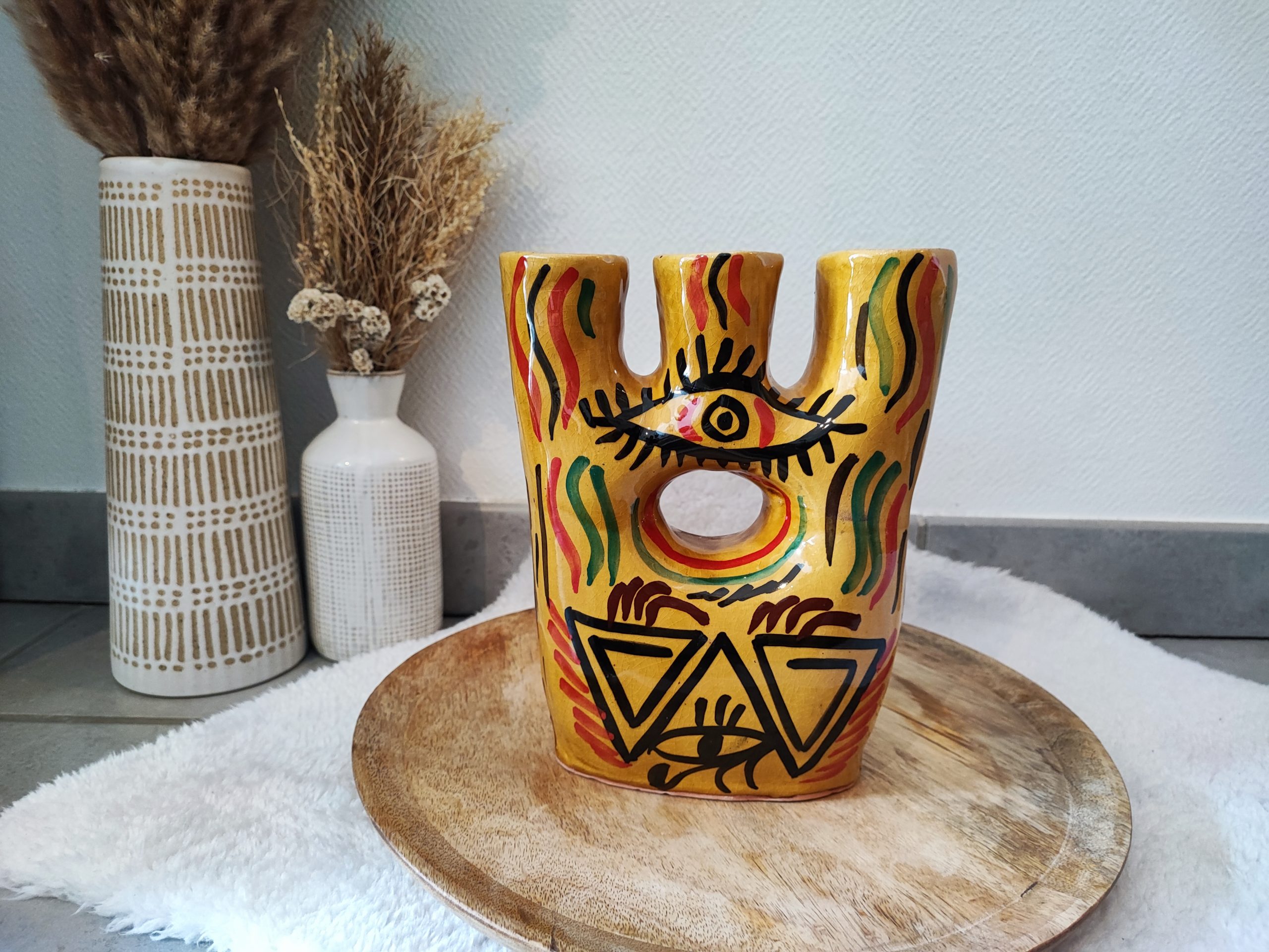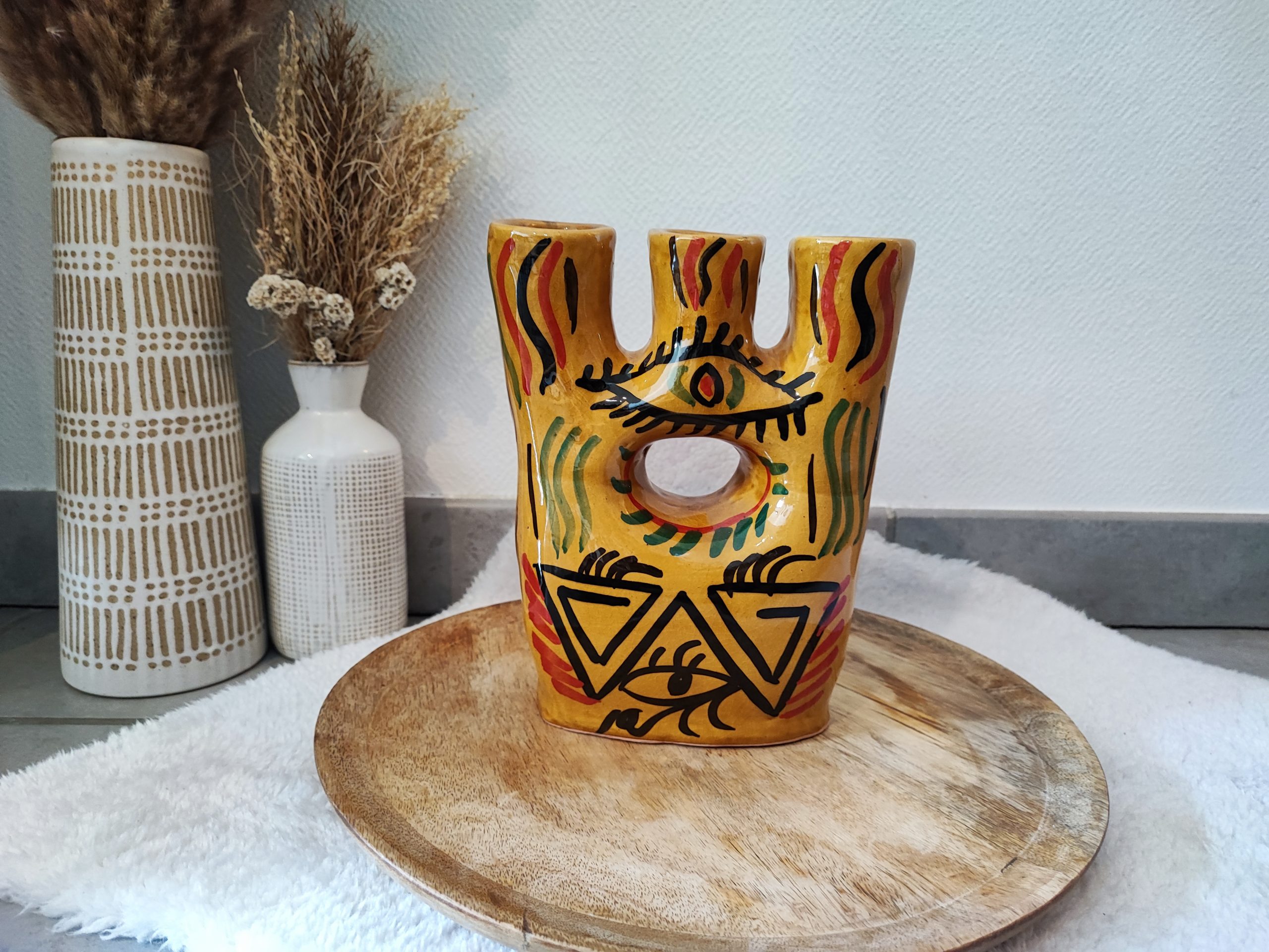 Illuminez votre espace avec notre bougeoir EYE en céramique jaune, une œuvre d'art inspirée de l'artisanat marocain. Mesurant 23 cm de hauteur, ce bougeoir est une pièce de décoration ensoleillée qui apporte de la chaleur et de la vitalité à votre intérieur. Créé avec soin par des artisans marocains talentueux, il arbore des détails uniques qui reflètent la richesse de la tradition marocaine. Placez une bougie à l'intérieur pour créer une ambiance lumineuse et exotique, parfaite pour les moments spéciaux et les soirées romantiques.
