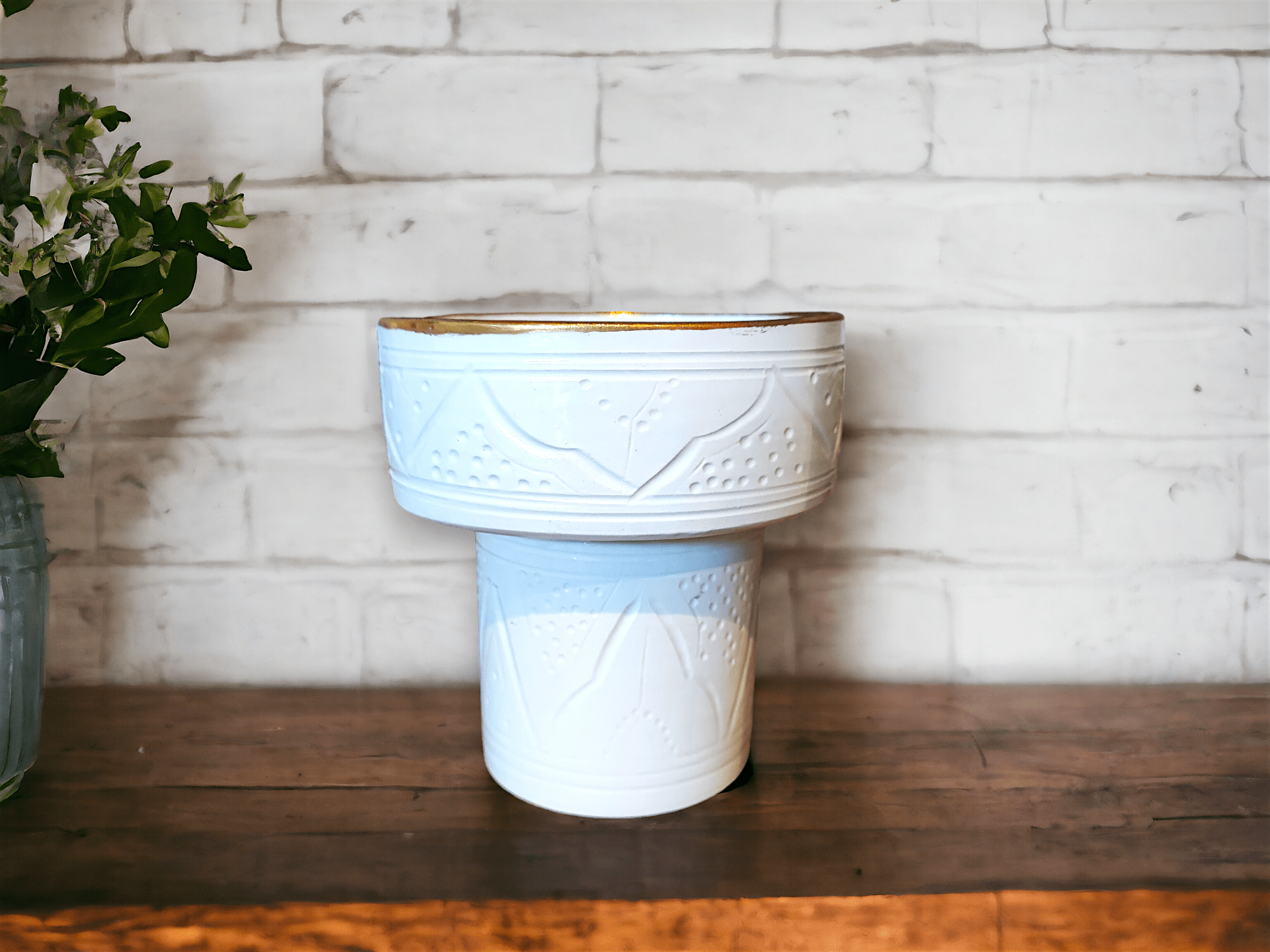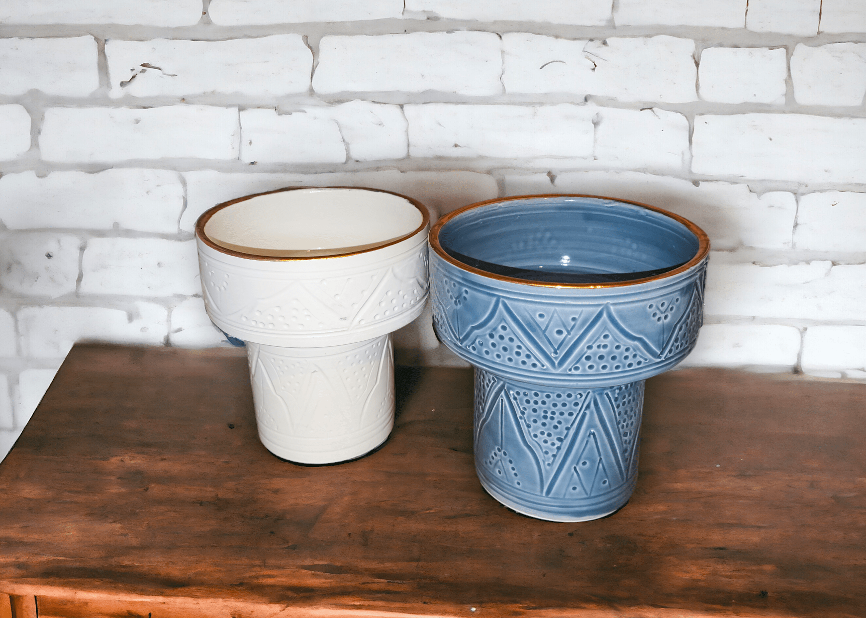 Le bougeoir SELMA est l'élément parfait pour ajouter une atmosphère chaleureuse à votre espace. En blanc ou en bleu, c'est le choix idéal pour habiller votre intérieur comme décoration, pour mettre en valeurs vos fruits ou vos gourmandises ou encore pour créer une ambiance tamisée avec une bougie à l'intérieur. Ses motifs traditionnels marocains, réalisés à la main par des artisans expérimentés, ajoutent une touche d'authenticité. Le rebord doré caractéristique de la collection SELMA apporte un côté moderne et raffiné. Cette finition élégante contraste merveilleusement avec l'ensemble uni, créant ainsi un équilibre parfait entre tradition et modernité.