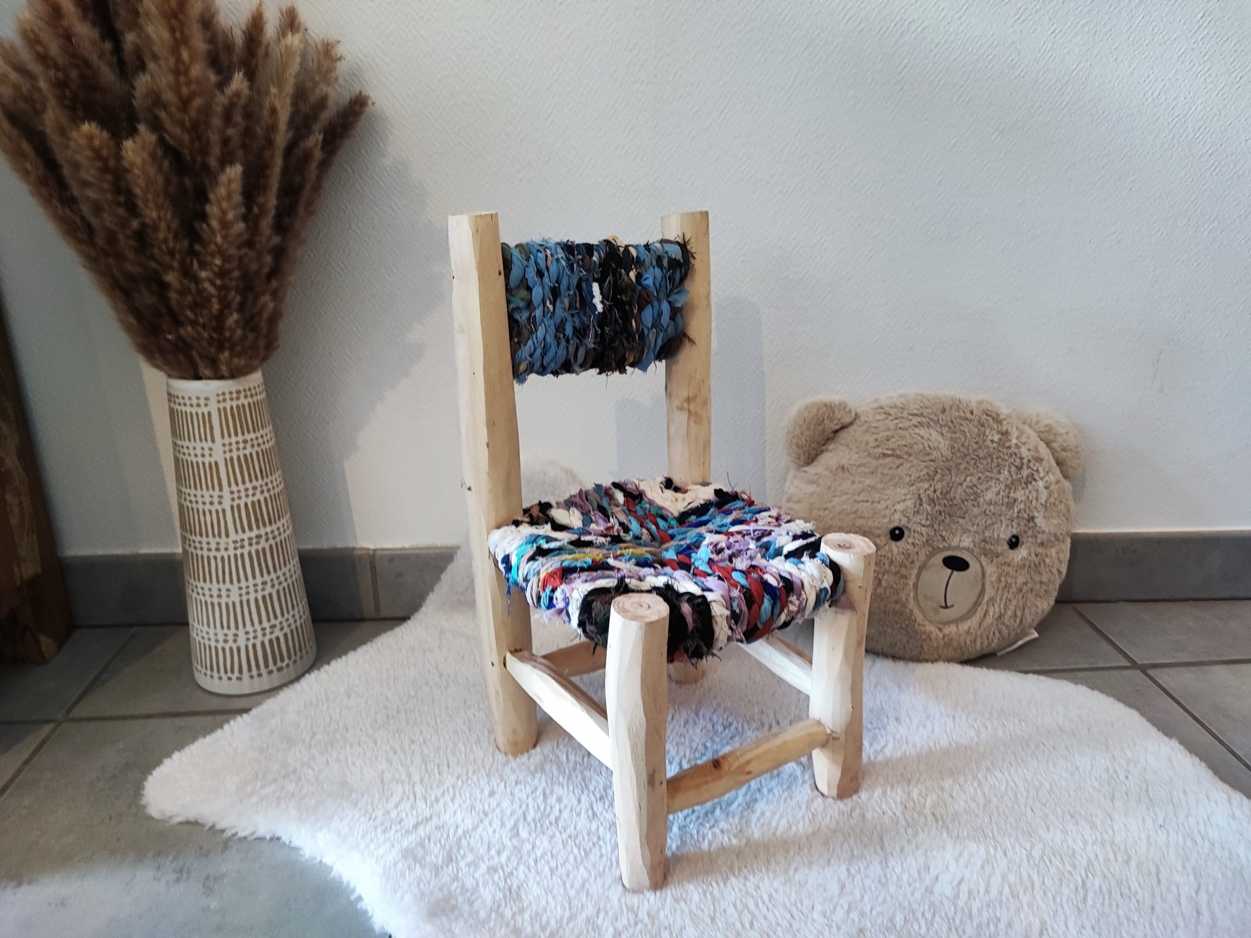 Découvrez notre chaise MILA colorée pour enfant artisanale en bois, fabriquée avec amour à Marrakech. Faite à la main avec des matériaux naturels, tels que le bois de citronnier, en les fibres textiles recyclées et colorées, cette chaise de 44x21x22 cm (hauteur x largeur x profondeur) est le choix parfait pour offrir à votre enfant une pièce unique et confortable, tout en soutenant l'artisanat local.