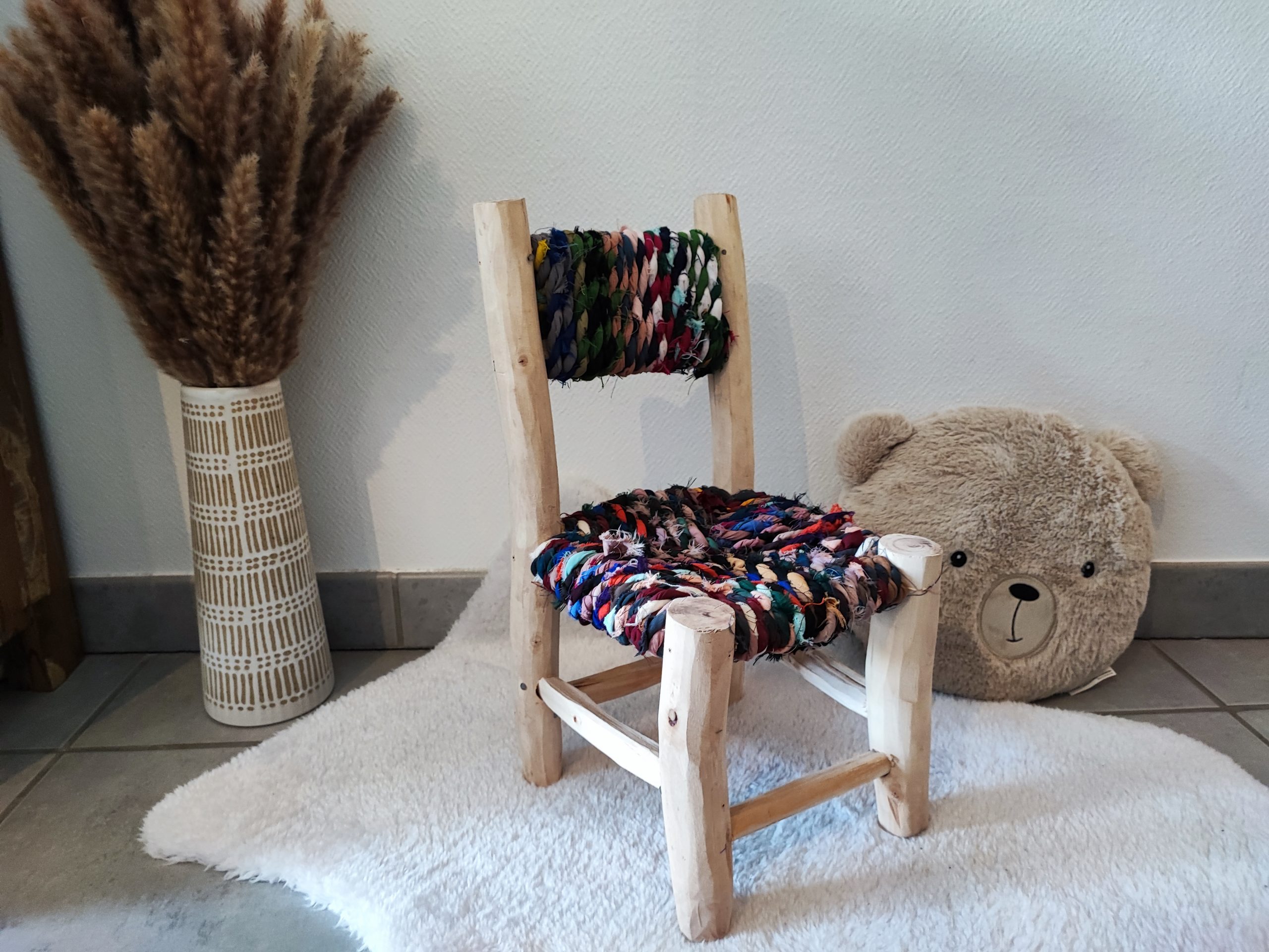 Découvrez notre chaise MILA colorée pour enfant artisanale en bois, fabriquée avec amour à Marrakech. Faite à la main avec des matériaux naturels, tels que le bois de citronnier, en les fibres textiles recyclées et colorées, cette chaise de 44x21x22 cm (hauteur x largeur x profondeur) est le choix parfait pour offrir à votre enfant une pièce unique et confortable, tout en soutenant l'artisanat local.