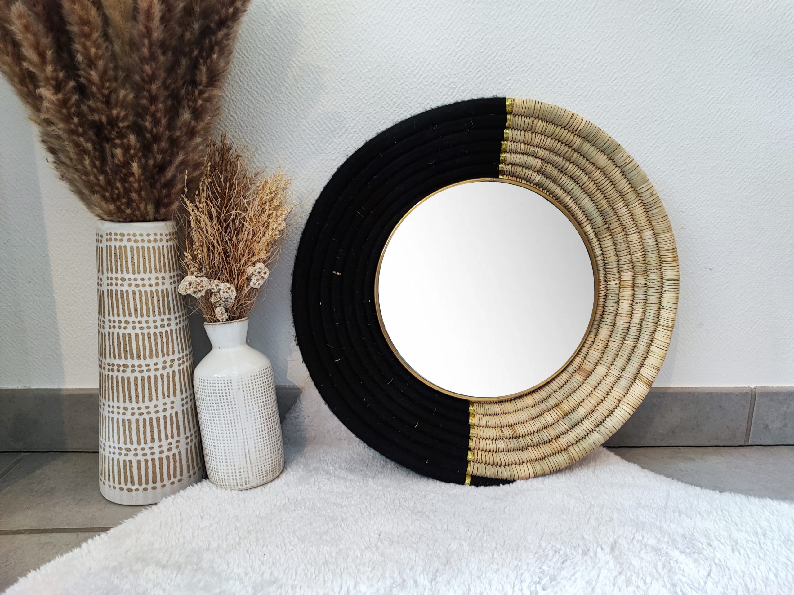 Le Panier Miroir CHEBI est une fusion de fonctionnalité et d'élégance berbère. Chaque panier est une pièce unique, et vous pouvez choisir entre différents motifs et designs berbères. Chaque panier miroir est conçu avec soin, intégrant un miroir au centre. Mesurant environ 45 cm de diamètre, ces paniers miroirs apportent une touche d'authenticité berbère à votre intérieur. Accrochez-les au mur pour ajouter une note de sophistication et de tradition à votre décoration.